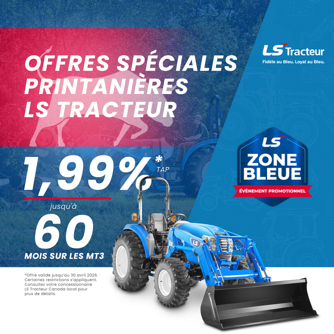 Pour un temps limité, LS Tractor Canada offre 1,99 % pour 60 mois sur certains modèles MT3. Nous avons hâte de vous accueillir dans la famille LS Tractor. N’oubliez pas : une fois que vous aurez opté pour le programme Bleu et que vous aurez pris connaissance de nos programmes et de notre service exceptionnels, vous voudrez rester Bleu pour toujours.