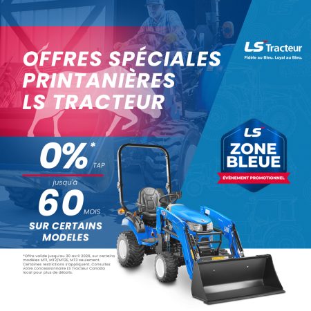 Contactez votre concessionnaire LS Tractor local dès aujourd'hui ! Pour un temps limité, LS Tractor Canada offre un taux d'intérêt de 0 % pendant 60 mois sur certains modèles. Nous avons hâte de vous accueillir dans la famille LS Tractor.…